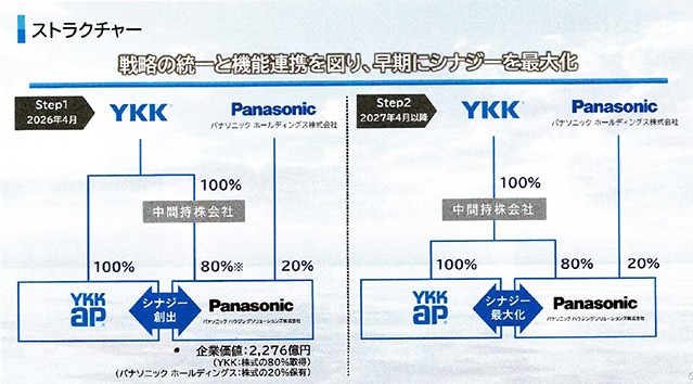 今後については、ステップ1として、26年4月に、YKK100%の中間持株会社(名称未定)を設立、持株会社がPHSの株式の80%取得(20%はPSHが保有)し、シナジーの創出を開始する。その後ステップ2に移行、27年4月にはYKK APの株式も中間持株会社保有する形で、両社のシナジーを最大化する2段階で進行すると説明した。両社の事業領域は、重複する部門が少ないため、工場の合理化を行う必要も無く、雇用も維持できるとの考えを示した。